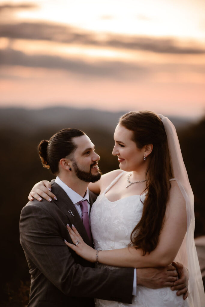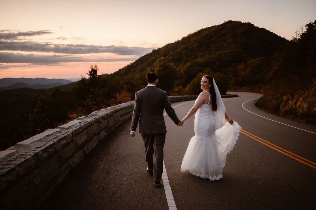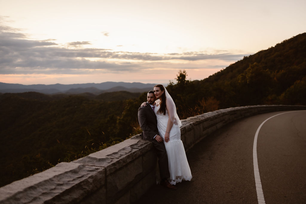 As the sun began to dip lower, we transitioned into their bridal portraits. This is where the Foothills Parkway truly shows off! The winding road, the wide-open views, and the pastel tones of sunset created such a dreamy atmosphere. Ansley’s dress picked up the light in the most ethereal way, and Corey couldn’t stop smiling as they explored the overlook together, hand in hand.